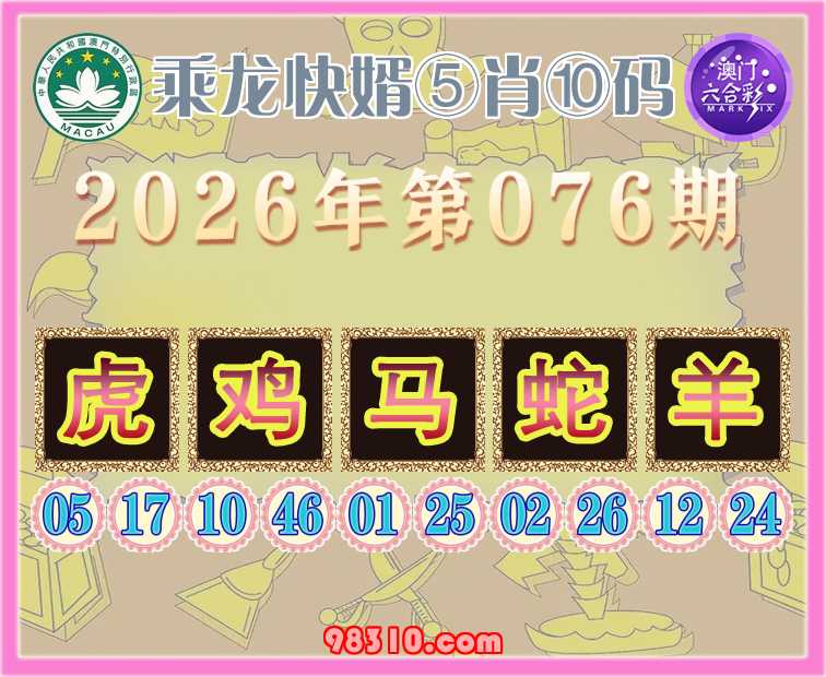 076期:〖乘龙快婿〗 ⑤肖⑩码【虎鸡马蛇羊】开:蛇02准验证上榜