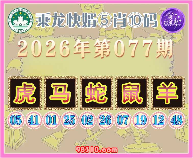 077期:〖乘龙快婿〗 ⑤肖⑩码【虎马蛇鼠羊】开:00准