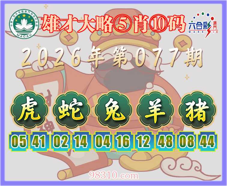 077期:『雄才大略』 ⑤肖⑩码【虎蛇兔羊猪】开:00准